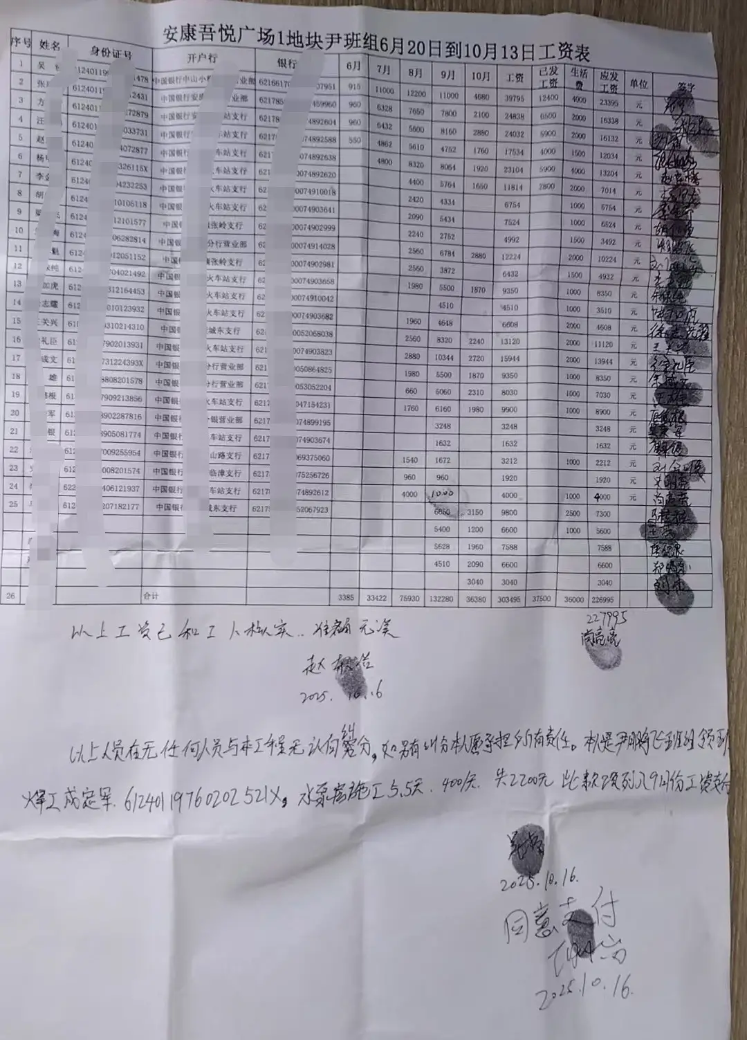 现场通过徐先生等人提供的工资表显示,6月20日到10月13日共计29人,应发工资合计显示227995元,已发合计37500元。此外还有一张调解协议,协议显示陕西乾州建筑工程有限公司需在规定时间内支付工人对应月份工资。