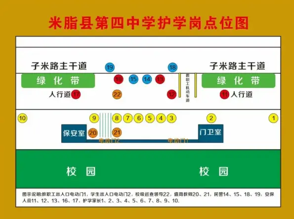一是落实站位图,米脂县公安局指导学校制定护校护校警力站位图24张,明确了学校各方护校力量在校园周边的具体位置。上下学高峰时段,校警、保安和家长志愿者按照站位图的要求,迅速在指定位置执勤,有效维护校园周边的治安秩序。二是理清职责单,职责单详细列出了派出所民辅警、交警大队民辅警、学校值周领导、学校安保和学生家长等所有参与护校工作人员的职责任务,确保上放学期间在校园周边发生极端案事件时,各方力量能够迅速响应,及时处理。三是完善签到册,加强对护校人员的管理,建立了签到册制度。护校警力、学校保安、执勤家长均需要在签到册上签字确认,确保护校人员在岗在位,有效避免护校力量的缺勤、迟到问题。四是抓好评价表,由学校、公安共同对护校人员的工作态度、工作效果、应急处置能力等方面定期进行评价和考核,及时发现并纠正存在的问题和不足,推动护校工作不断改进和提升。