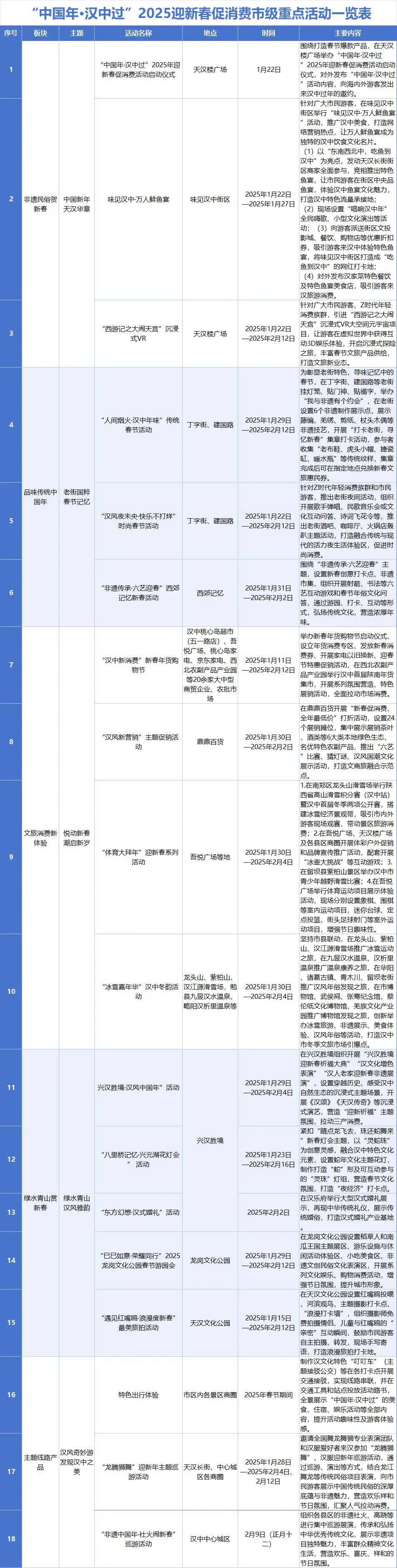 春节期间,汉中市统筹全市优质资源,指导各县区、兴汉新区管委会推出春节文旅、商旅、体旅等多业态融合促消费活动152项,吸引游客来汉旅居消费。