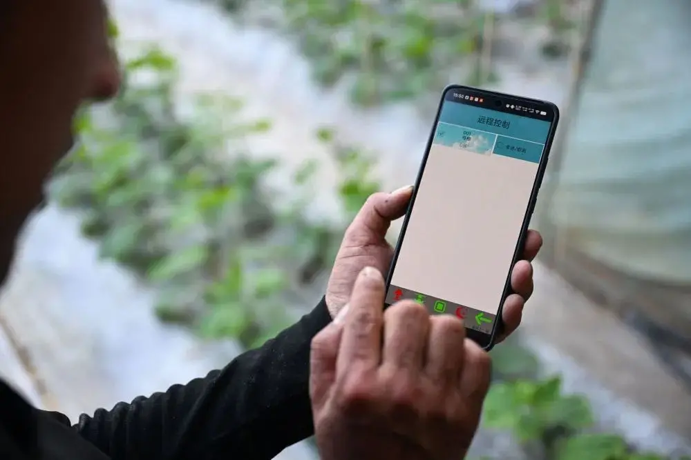 图为位于延安市安塞区招安镇枣湾村的设施蔬菜生产基地,一位种植户通过手机软件对大棚保温被进行控制。新华社记者 张博文 摄