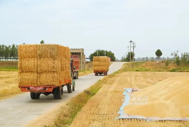 6月5日,大荔县赵渡镇,秸秆被打捆拉走回收再利用。