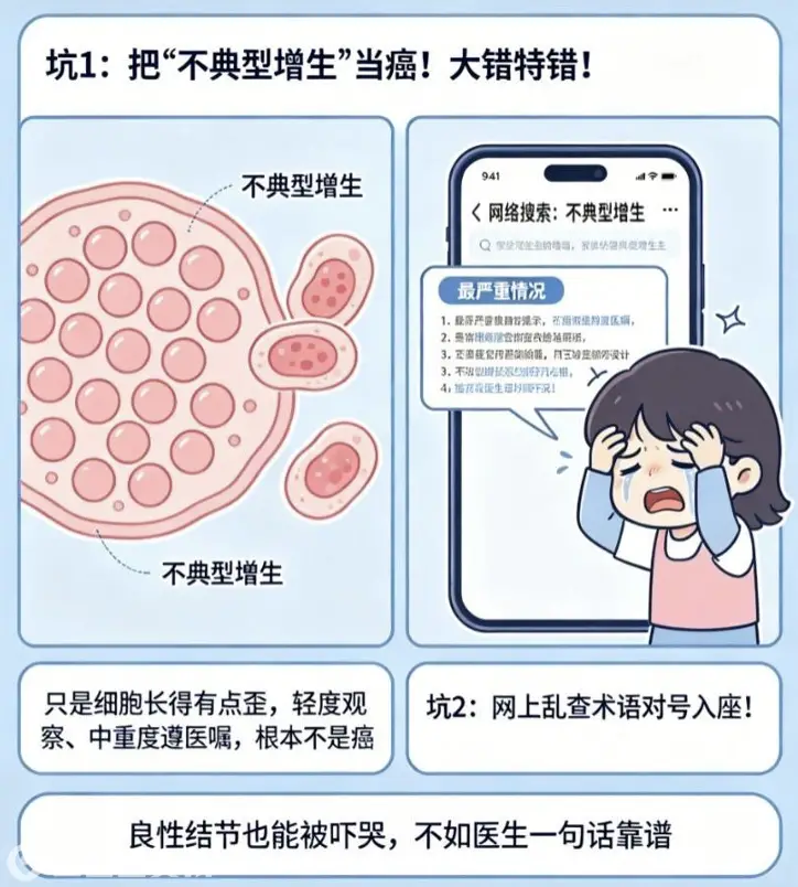 坑1:把“不典型增生”当癌!大错特错!只是细胞长得有点歪,遵医嘱应对就好,不要直接等于癌;