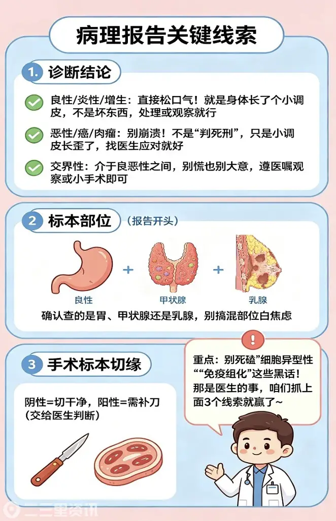 重点:别死磕“细胞异型性”“免疫组化”这些黑话!那是医生的事,咱们抓上面3个线索就赢了~