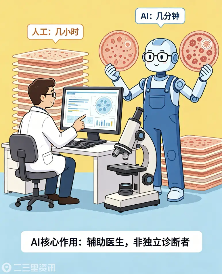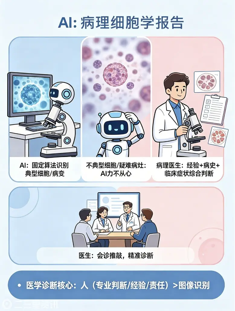 简单来说,AI能“看片”,却不懂“看病”;能识别典型病变,却无法应对复杂的疑难案例。它可以高效完成基础的阅片筛选工作,帮医生节省时间和精力,让医生能专注于更复杂的诊断和治疗方案制定;而病理医生的专业判断、临床经验和责任担当,是AI无法复制的——毕竟,医学诊断的核心是“人”,而非单纯的“图像识别”。