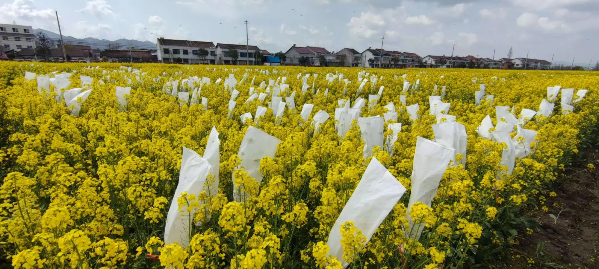 在位于周家山镇黄沙社区的制种油菜试验示范基地,部分优质植株已经被农科院专家们进行了套袋、挂牌,彷佛穿上了白色外套。