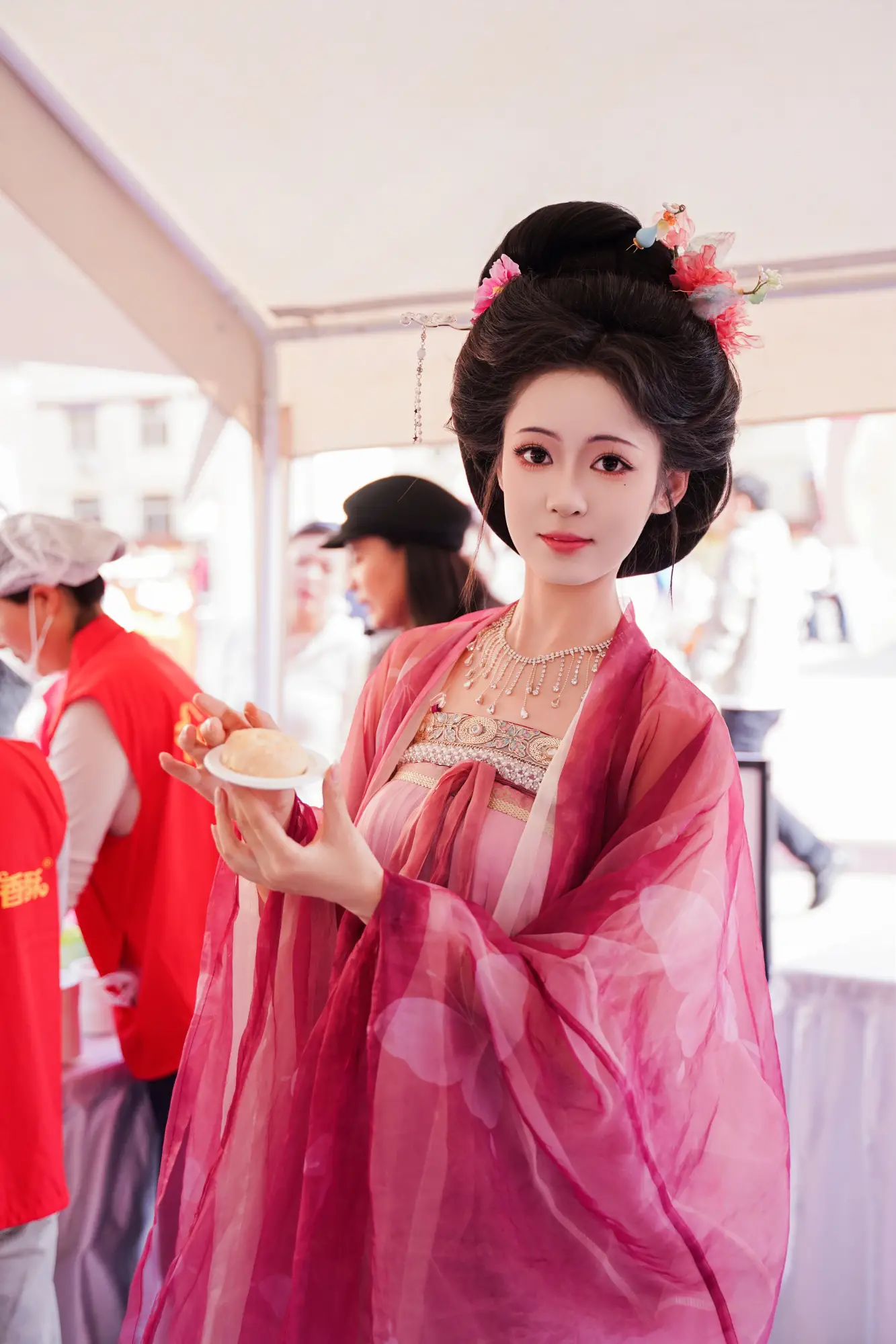 “十二花神”也来到了饼王挑战赛的活动现场。梅花、杏花、桃花、芍药、石榴花、荷花、蜀葵、桂花、菊花、芙蓉、山茶花、水仙花,一花一态,一仙一景。大家纷纷与十二花神合影打卡,一番春花春景,热闹纷呈。现场也准备了丰富的免费试吃试饮区域,加热的红星软香酥、红星闪闪石榴汁、钟楼小奶糕、聚小美西梅汁,更有礼泉特色美食鞋底膜、礼泉非遗老宋家醪糟等。现场还设置了非遗手作体验区,剪纸、泥塑、金石拓印、版画等,参赛选手及围观观众,既一站式品尝了地道礼泉特色食品,也体验了礼泉乡村旅游民俗文创。将静态的文化资源转化为动态的消费体验,让更多人在”玩”中了解礼泉,在“吃”中感受礼泉文化。