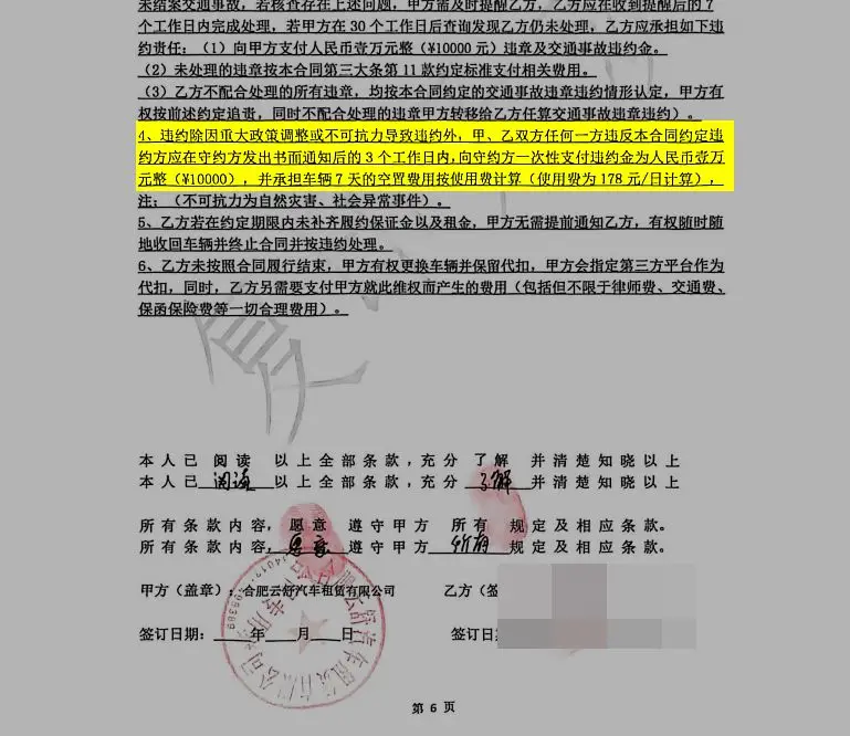 记者从张先生与“合肥宜开云迹汽车科技有限公司”签订的合同中看到,车辆使用性质为营运,张先生需支付履约保证金1000元。而违约条款约定,若应聘者违约,需支付违约金6000元,并承担车辆7天空置期使用费。另一份与“合肥云舒汽车租赁有限公司”签订的租赁合同则约定,每周租金750元,履约保证金3000元,若双方任何一方违约,违约方需支付违约金1万元。