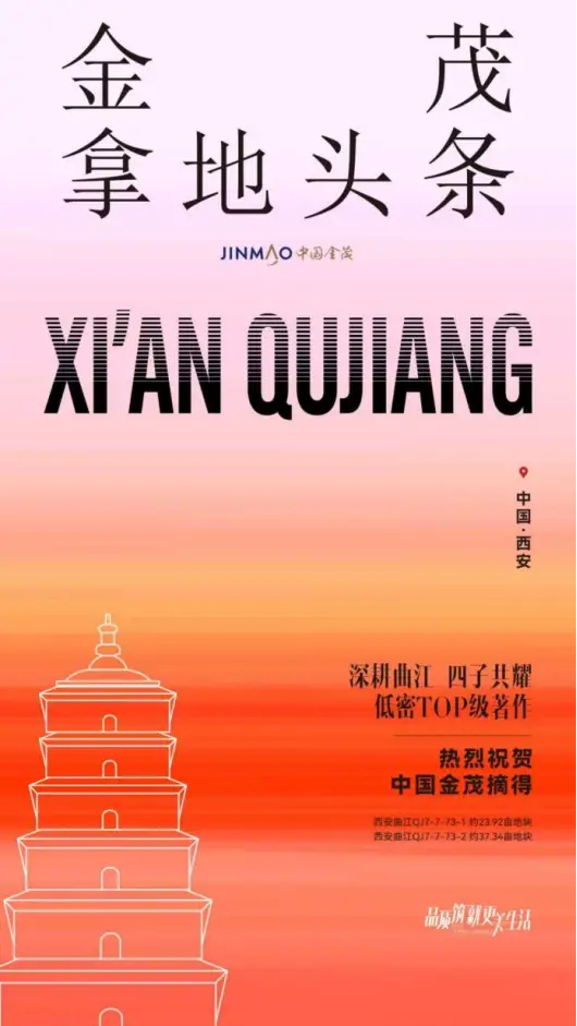 3月6日,中国金茂斩获西安曲江两宗低密优质地块,容积率仅1.2,建筑不高于3层。该地块集低密生态、顶级教育、完善交通与高端生活资源于一体,延续了金茂在曲江板块的高端布局。此次摘地一举缔造西安土地市场三大现象:楼面价刷新城市新高、容积率创主城新低、顶配资源环绕。