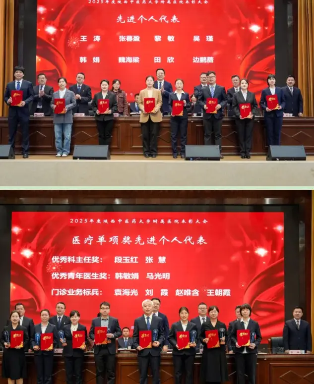 期间,医院同步举行2025年度总结表彰大会,将表彰与议事有机结合,凝聚奋进力量。党委委员、副院长董盛宣读了《关于表彰 2025 年度先进集体、先进个人和单项奖的决定》,班子成员分别为获奖代表颁发荣誉证书和奖杯,充分发挥先进典型的示范引领作用,激励全院职工崇尚先进、争当先进、勇毅前行。