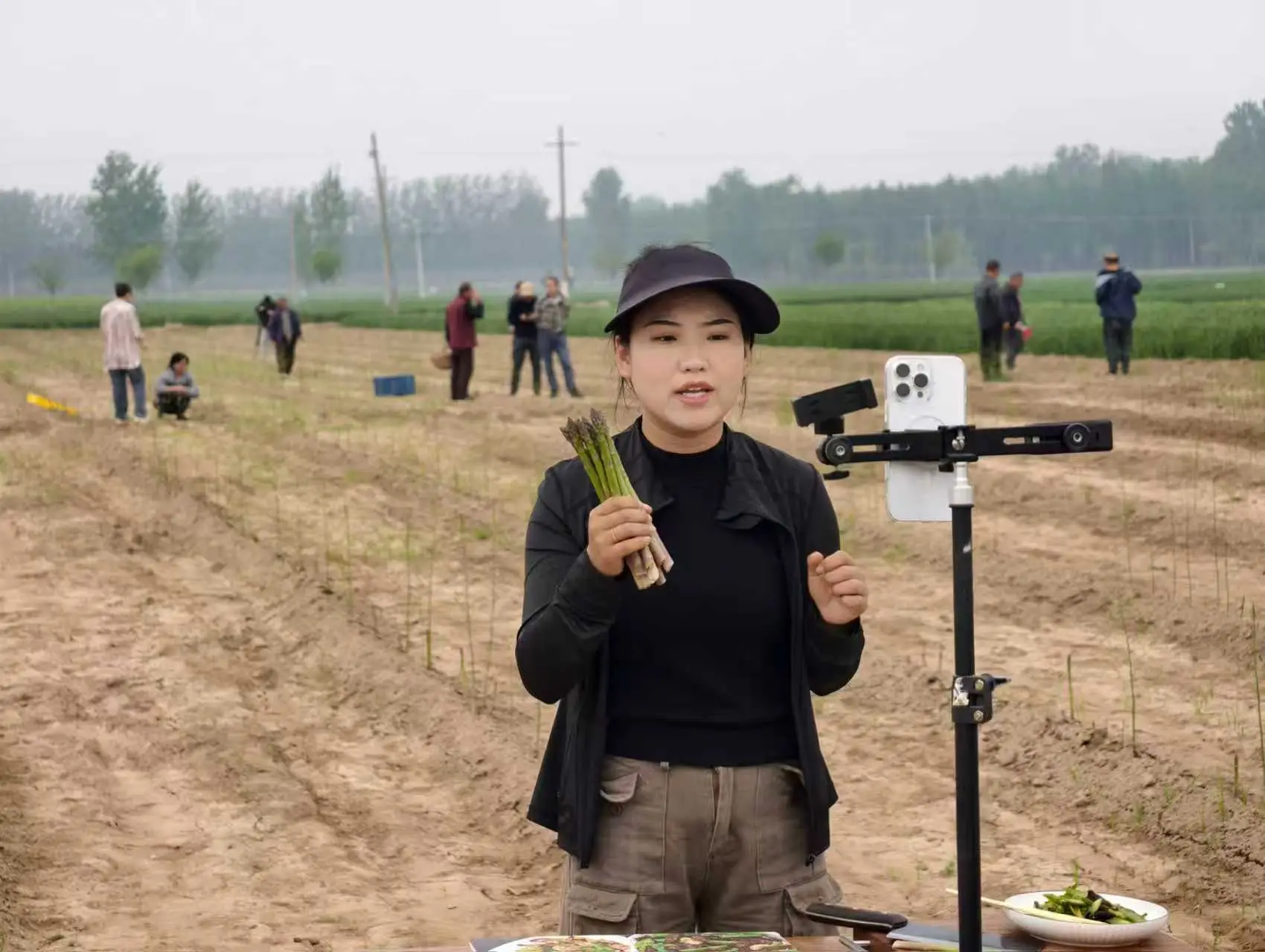 4月14日清晨六点,渭南市大荔县苏村镇槐园村的芦笋地还浸在微凉的晨雾里,露水顺着翠绿的笋尖滚落。田埂边支起一口铸铁锅,火苗舔着锅底,切好的芦笋片倒进热油,滋啦一声爆出清鲜的香气。00后姑娘马绒绒一手翻炒芦笋片,一手对着手机笑:“家人们闻闻!今早刚采的头茬芦笋,撒点盐就鲜掉眉毛,现采现发下午就走!”