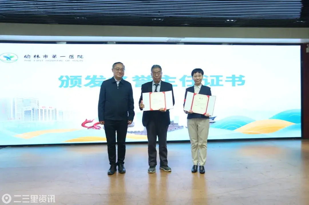 李和平向焦富勇教授、张月萍教授颁发榆林市第一医院儿科名誉主任聘书。