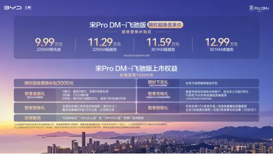 宋Pro DM-i飞驰版此次推出纯电续航里程220km及301km两个版本共4款车型。其中,220KM领先型售价9.99万元起,强势引领超200公里纯电续航的插混SUV进入9万级时代。