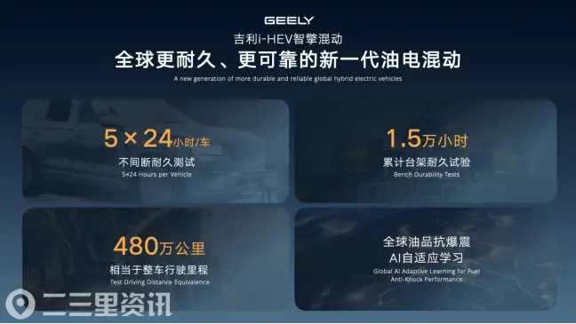 多年来,吉利始终以严苛标准坚守产品可靠性,为全球用户打造更耐久、更可靠的高价值产品,这一理念也同样贯穿i-HEV智擎混动技术的开发全过程。依托全球最极限验证体系,吉利对i-HEV智擎混动累计开展了1.5万小时的台架耐久试验,相当于整车行驶里程约480万公里,比传统混动标准高出20%以上;还通过AI自学习方式,让发动机自适应全球不同油品的抗爆性指标,确保i-HEV智擎混动产品在全球任一地区都能安全高效行驶。