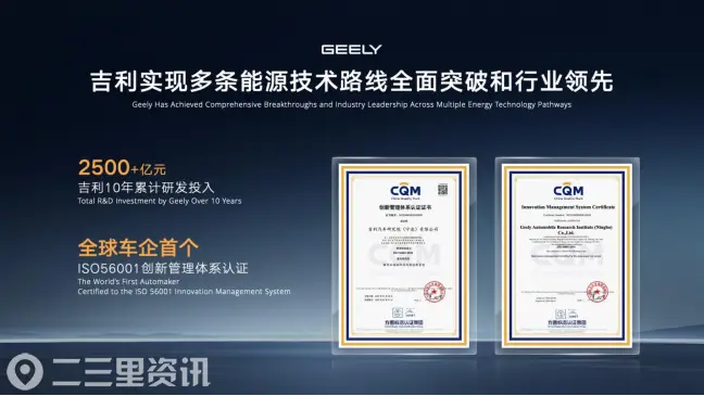 造车28年来,吉利汽车集团始终坚持能源多元化发展路径,在“两个蓝色吉利行动计划”指引下,已率先构建起覆盖纯电、混动、增程、甲醇、换电、高效燃油等多能源技术体系。凭借神盾金砖电池、雷神AI电混2.0、SEP浩瀚超级电混、绿色甲醇能源等一系列创新动力技术,吉利汽车集团在多条能源技术路线上实现全面突破和行业领先,与雷诺组建全球最大动力公司HORSE,向全球25家豪华及主流车企输出领先动力技术;搭载最强2.0T动力的星瑞TCR赛车,承袭领克7年9冠的荣誉,将征战世界最高等级TCR赛场,不断将中国动力技术推向世界舞台。近期,吉利汽车集团还荣获全球车企首个ISO 56001创新管理体系认证,标志着国际标准组织对吉利系统化创新能力的权威认可。
