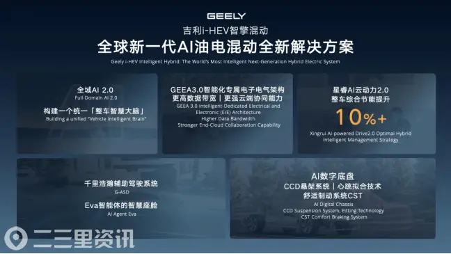 作为全球首个完成全域AI布局的车企,吉利通过全域AI 2.0对智驾域、座舱域、底盘域、动力域等各个域的感知、数据、信息的全面共享,构建了一个统一的“整车智慧大脑”。为了满足用户对油电混动“像电车一样聪明”的需求,吉利i-HEV智擎混动技术在全域AI 2.0赋能下,全面搭载GEEA 3.0智能化专属电子电气架构,具备了更高的数据带宽与强大的端云协同能力,颠覆传统混动的智能体验。
