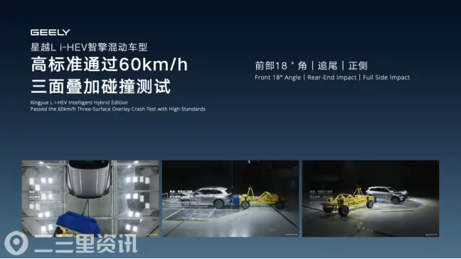 整车安全方面,为充分检验i-HEV智擎混动的安全实力,星越L i-HEV智擎混动经由中国汽研认证,在60km/h的车速下,成功通过全球首个HEV车型前部18°角偏转+后部+正侧三向叠加碰撞测试,以非常规、超标准的极限测试,全面检验i-HEV智擎混动车型的硬核安全实力。
