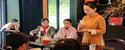 随后,一场雅致的茶艺表演为研学活动增添了浓浓文化韵味。茶艺师动作行云流水,温杯、投茶、冲泡、奉茶,一招一式尽显优雅,伴随着袅袅茶香,为孩子们生动展现了茶道文化的礼仪与美感。孩子们静心观赏、认真学习,部分学生还在茶艺师的指导下,亲手体验泡茶流程,并将泡好的茶水恭敬地奉给老师,在沉浸式体验中,感受传统礼仪的魅力,接受美育熏陶,让文化浸润、品德涵养于无声处落地生根。