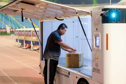 4月17日,顺丰全网足球联赛华北赛区开幕式现场,在顺丰工作了二十七年的快递小哥李长新和他的新搭子——一辆无人快递车缓缓入场。李长新打开无人车门,拿出足球,走向绿茵场,热情开球,拉开顺丰全网足球联赛最后一个大区赛的序幕。