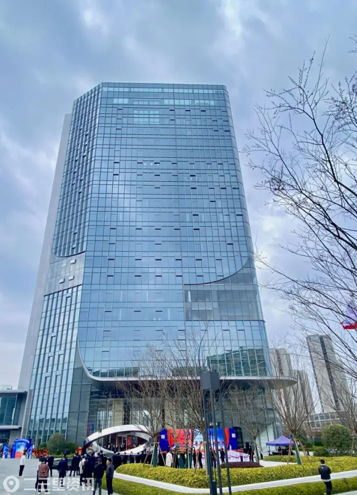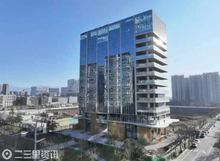 未来之瞳西北角,一栋银灰色现代建筑挺拔矗立,其流畅的外立面曲线如盛唐丝绸铺展,与造型别致的未来之瞳融合相印,勾勒出极具辨识度的城市天际线。