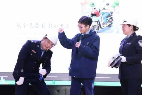 “车水马龙校门口,有序停放才长久。车行千里路漫漫,头盔戴好保平安。”活动现场,学生们通过学习安全知识、观看交通事故警示案例,内心深受触动,纷纷表示将以身作则,严格遵守交通法规,同时主动向家人、朋友传播安全知识,争做安全理念的践行者与传播者。曹浜副校长在总结发言中指出,交警部门的专业宣讲、情景演绎与装备展示,家长代表的真诚分享,全体学生的积极参与,让本次安全教育兼具温度、力度与实效。他寄语全体学生,要将安全知识牢记于心、外化于行,争做自身安全的守护者、文明出行的践行者;同时恳请全体家长持续与学校、公安部门并肩同行,构建全方位、立体化的校园安全防护网络,共护孩子平安成长。