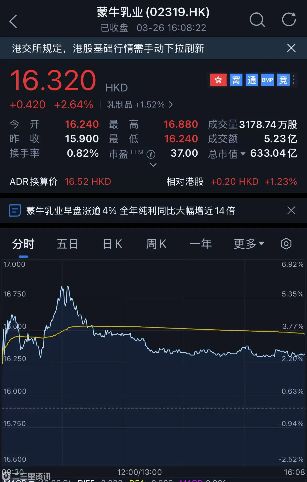 受业绩利好带动,蒙牛股价26日逆势上涨,报收16.32港元,涨幅2.64%,盘中一度涨超6%。花旗表示,预计蒙牛2026年销售额恢复至中个位数至低个位数增长,利润率重新扩张,维持对蒙牛的“买入”评级。