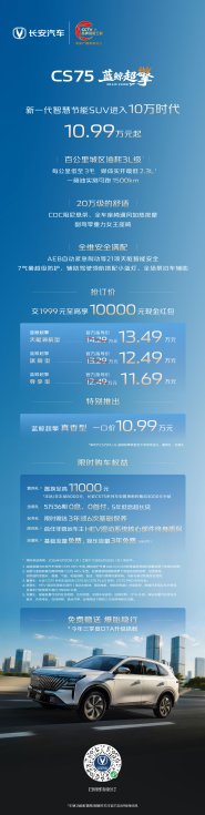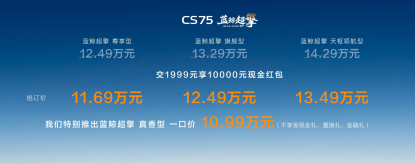 第四代CS75PLUS蓝鲸超擎发布抢订价:交1999元至高享10000元现金红包,蓝鲸超擎尊享型11.69万元、蓝鲸超擎旗舰型12.49万元、蓝鲸超擎天枢领航型13.49万元,并特别推出蓝鲸超擎真香型一口价10.99万元(不享受现金礼、置换礼、金融礼);除蓝鲸超擎真香型外,购其他配置车型用户可享五大限时购车权益:置换礼:置换至高11000元(本品/非本品8000元,长安CS75系列车型置换限时叠加3000元补贴);金融礼:5万36期0息、0首付、5年低息超长贷;保养礼:限时赠送3年或6次基础保养;质保礼:首任非营运车主HEV混动系统核心部件终身质保;流量礼:基础流量免费,娱乐流量3年免费(6G/月)。