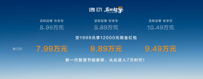 第四代逸动蓝鲸超擎发布抢订价:交1999元享12000元现金红包,蓝鲸超擎劲享型抢订价7.99万元、蓝鲸超擎悦享型抢订价8.89万元、蓝鲸超擎智享型抢订价9.49万元。购全系车型用户可享五大限时购车权益:置换礼:置换至高7000元(本品4000元,非本品2000元,长安逸动系列老客户限时叠加3000元补贴);金融礼:4万24期0息、0首付、5年低息超长贷;保养礼:限时赠送3年或6次基础保养;质保礼:首任非营运车主HEV混动系统核心部件终身质保;流量礼:基础流量免费,娱乐流量3年免费(6G/月)。