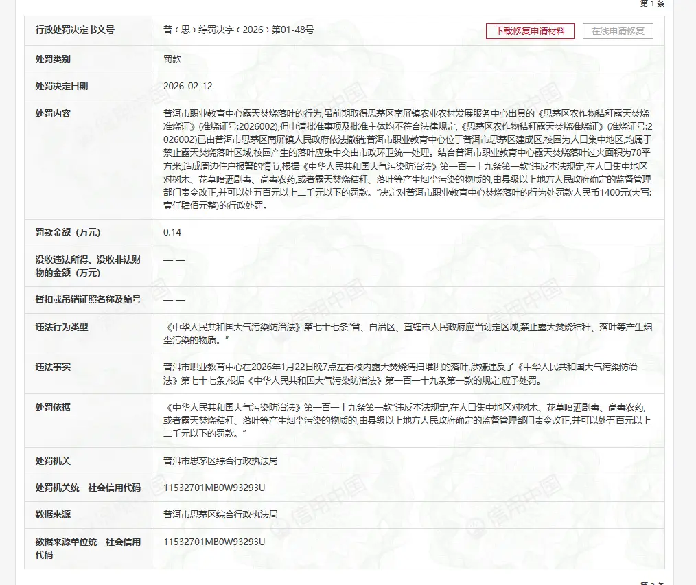 二三里资讯记者查询到,行政处罚决定文书号为:普(思)综罚决字(2026)第01-48号,处罚日期为2月12日,违法事实为普洱市职业教育中心在2026年1月22日晚7点左右校内露天焚烧清扫堆积的落叶,涉嫌违反《中华人民共和国大气污染防治法》第七十七条,根据《中华人民共和国大气污染防治法》第一百一十九条第一款的规定,应予以处罚。