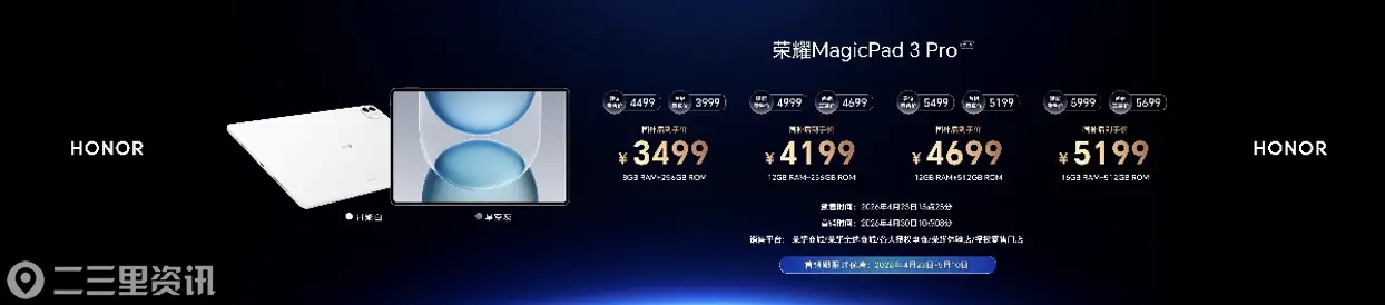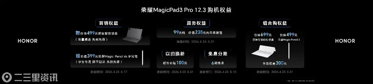 荣耀MagicPad3 Pro 12.3现已在荣耀商城、授权电商平台、荣耀体验店、授权零售门店等官方销售渠道开售,4月23日至5月17日期间,购买荣耀MagicPad3 Pro 12.3限时赠送价值499元原装智能键盘、学⽣认证送价值399元荣耀Magic-Pencil 4s手写笔;4月23日至5月10日期间,享6期免息分期;4月23日至5月31日期间,99元购价值238元2年碎屏宝、以旧换新补贴额外补贴100元,组合购原装智能触控键盘和荣耀Magic-Pencil 3触控笔⾄⾼优惠300元等福利权益。所有福利,数量有限,先到先得。荣耀MagicPad3 Pro 12.3国补优惠价3499元起。