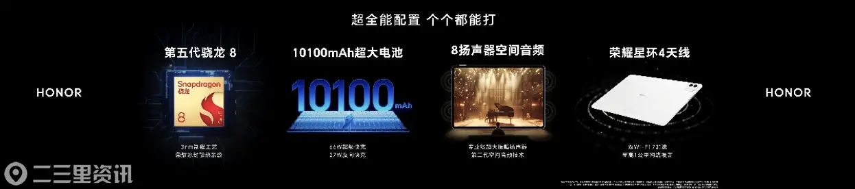 荣耀MagicPad3 Pro 12.3搭载第五代高通骁龙8旗舰芯片,配合荣耀冰封散热架构,实现满血性能稳定释放,高效平衡性能功耗,为多任务处理、视频后期、AI运算、3A游戏运行提供强劲性能;内置10100mAh超大电池,支持66W超级快充、27W反向充电,不仅告别续航焦虑,还能为iPhone等其他系统设备充电;荣耀自研星环四天线,支持双Wi-Fi 7加速,实现一公里超远距网络覆盖;八扬声器与第三代空间音频技术加持,进一步拓展了娱乐、学习等使用场景,结合全维度软硬件生态融合,覆盖用户使用痛点,打造全场景极致体验。