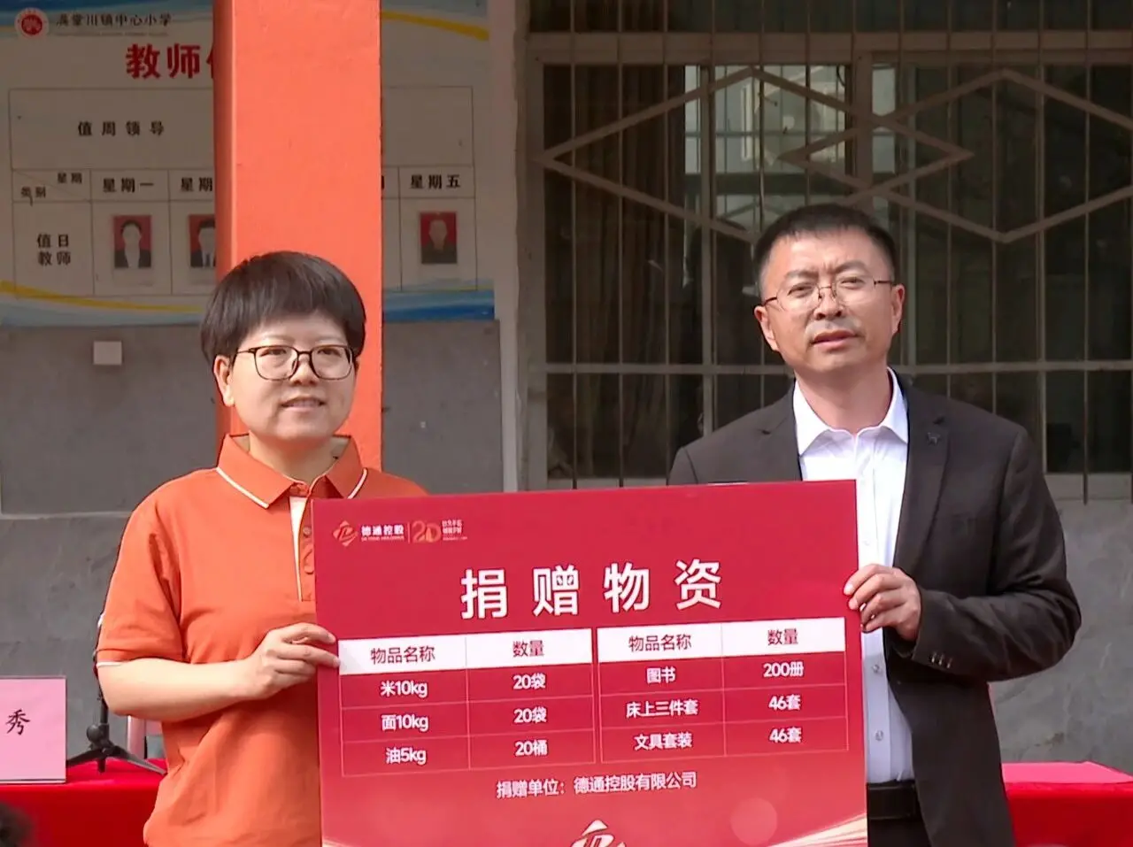 捐赠仪式上,各类捐赠物资分类整齐、摆放有序,学生们统一着装、列队整齐。企业代表与校方现场完成爱心物资交接,仪式庄重有序。本次捐赠涵盖生活用品、学习用品及各类图书等,惠及全校40余名学生。为感谢企业的爱心善举,校方特意为德通控股回赠锦旗,现场处处洋溢着温情与感动。