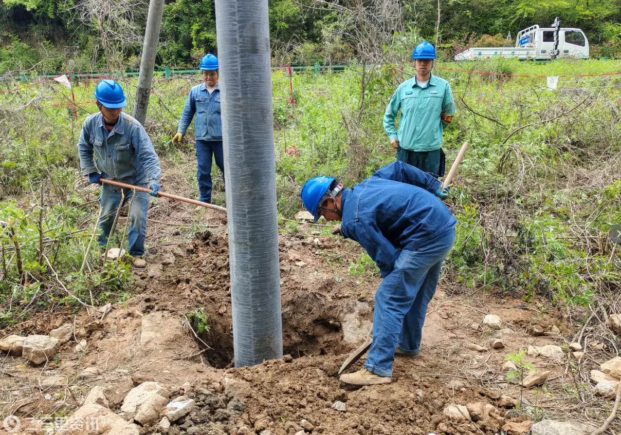 在该线路#259杆、312#杆消缺现场,晨雾刚刚散去,山脚下的土质因近期下雨显得有些松软泥泞。针对前期巡视发现的导线对地距离不足问题,施工队伍正在进行一场“拔高”手术。由于作业点所处地形限制,大型机械无法进入,施工人员只能依靠抱杆辅助人工立杆,“注意杆体垂直度,确保金具安装牢固,导线搭接要紧密,不能留任何安全隐患!”工作负责人全程监护,实时提醒作业人员规范操作。大家分工协作、默契配合,将2根12米长的崭新水泥杆分别稳稳植入基坑。随后,施工人员有条不紊地完成金具瓷件安装、导线搭接等工序,每一个接头、每一处固定都反复检查、确认,全力保障线路架设质量,从源头解决导线对地距离不足带来的安全风险,防范放电、触电等安全事故发生。