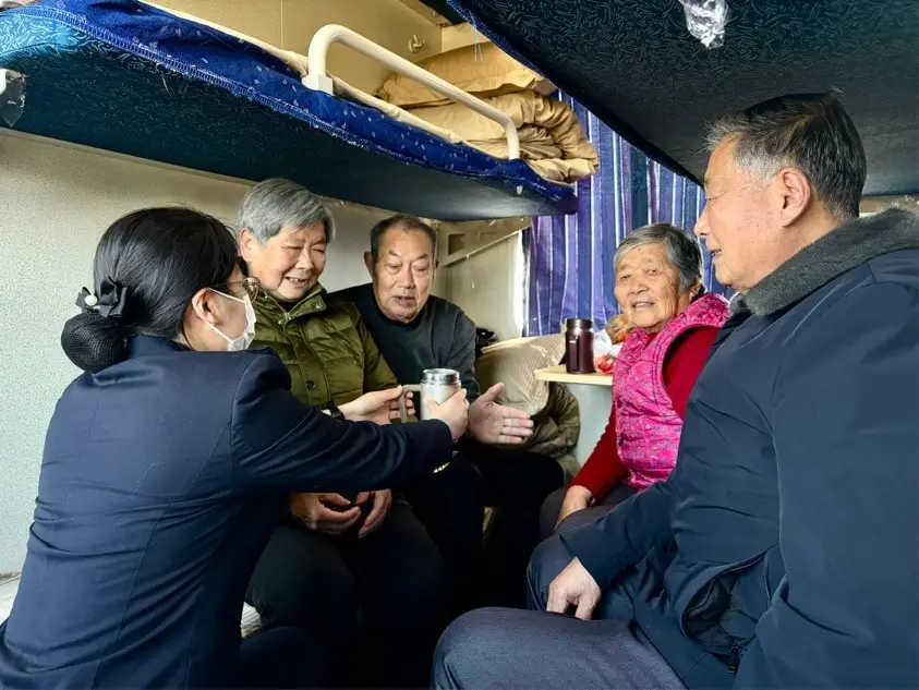 “春运头一趟车人多心忙,一上车就有人递热水、贴心照顾,就像自家孩子跟着回家,心里特别踏实。”一位老人感动地说道。