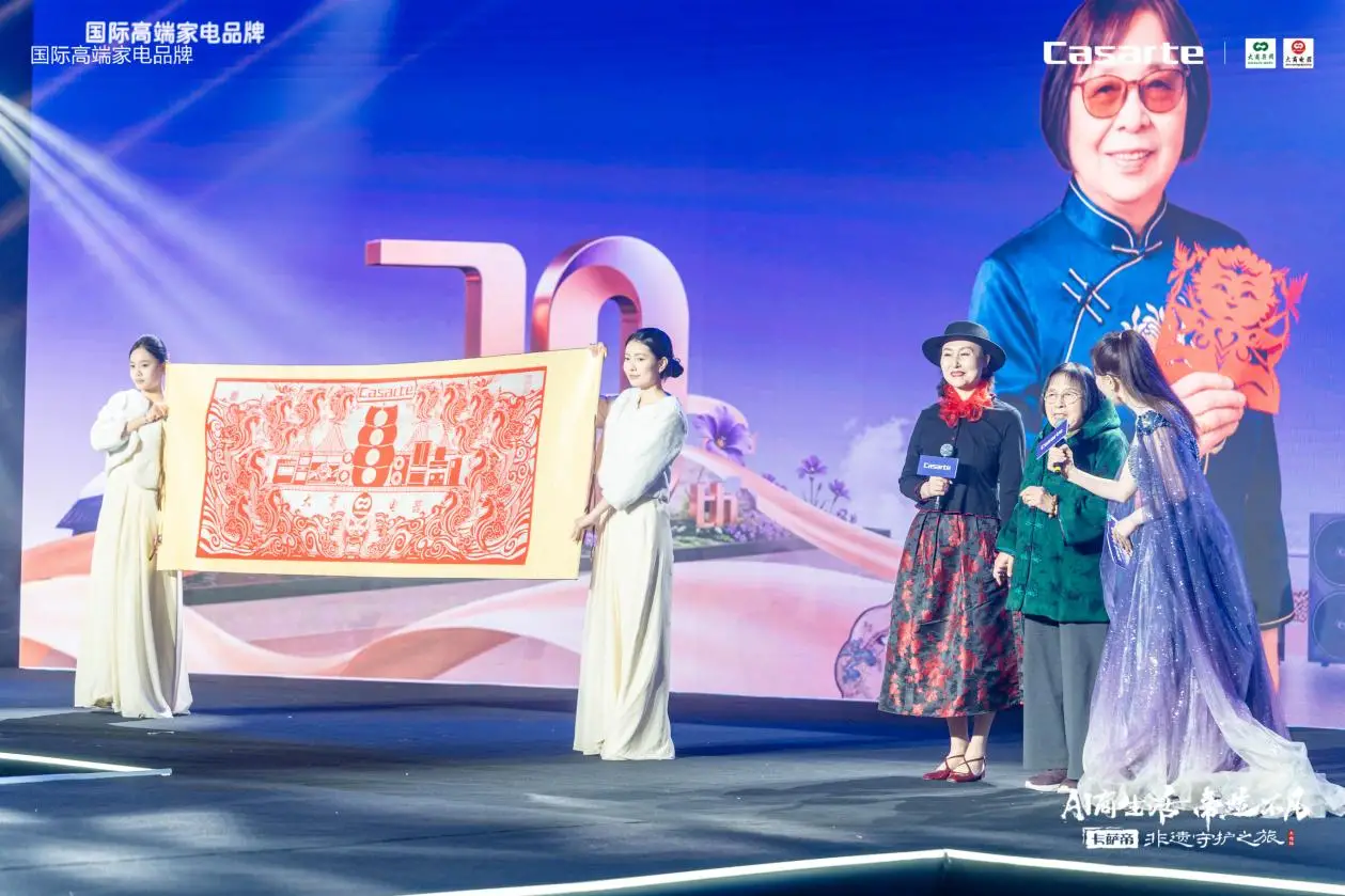 本次活动特别邀请国家级庄河剪纸非遗传承人韩月琴老师亲临现场,为卡萨帝和大商电器带来匠心定制的非遗剪纸作品。为致敬韩月琴老师深耕非遗、坚守文化根脉的匠心精神,卡萨帝领导为其颁发“非遗守护官” 荣誉证书。随后,这幅剪纸作品由卡萨帝赠予大商集团,让传统技艺在科技与品牌的携手守护下薪火相传。