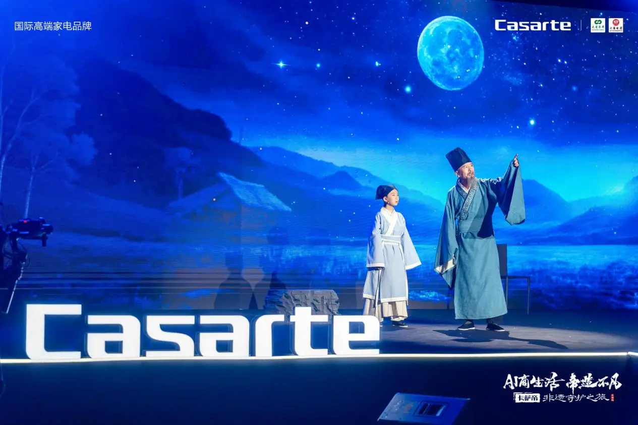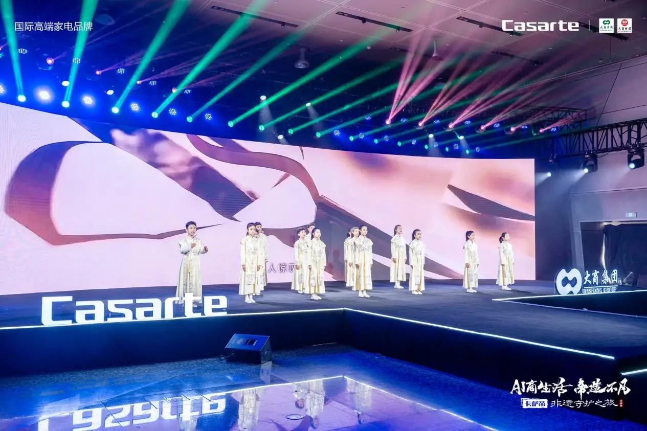 儿童群体表演《非遗里的中国》朗诵,用清澈稚嫩的童声唤醒千年非遗文脉,带领现场观众穿越历史长河,共赏中华传世瑰宝。卡萨帝以 AI 原创科技助力非遗焕发新生,让东方瑰宝在新时代绽放光彩。