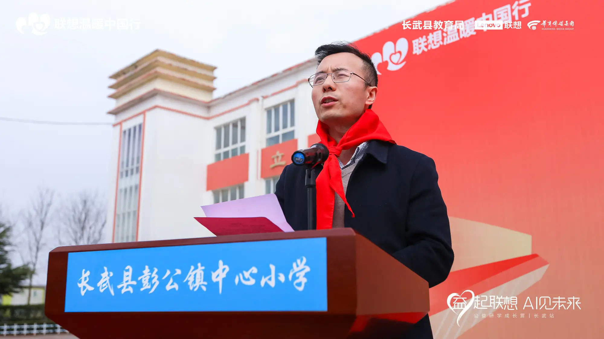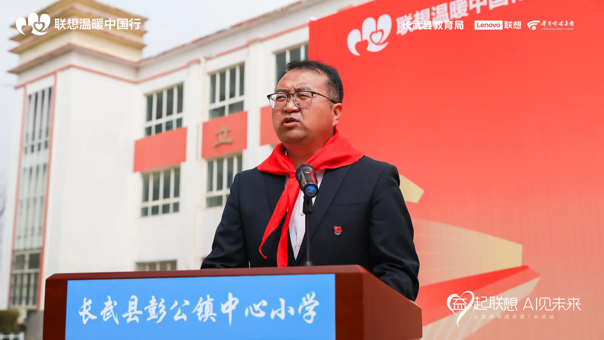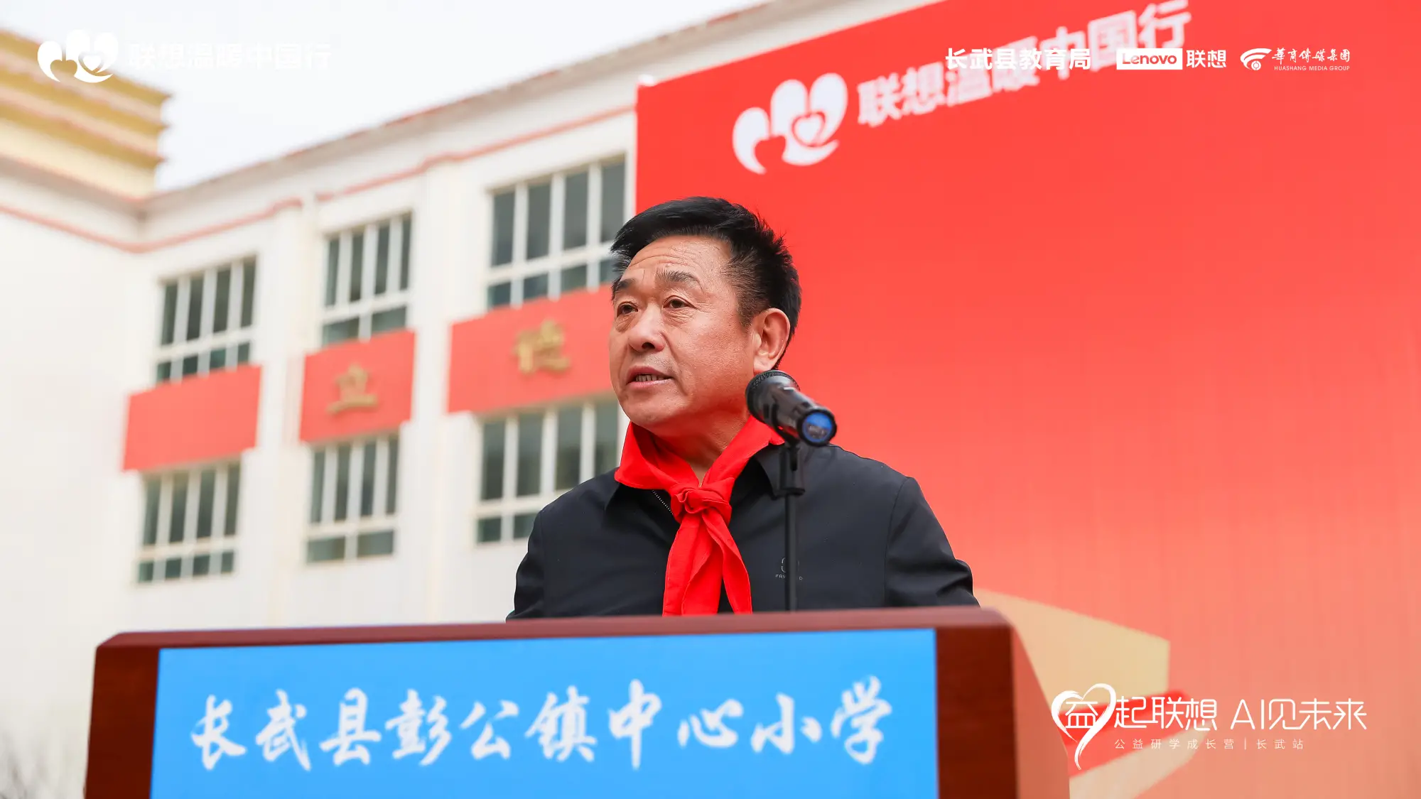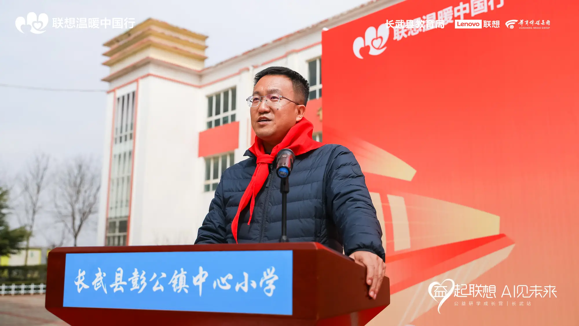联想中国政企业务陕西战区政教总经理杨纵代表联想集团发言时,首先对长武县教育局、彭公镇中心小学及所有参与活动的人员表示感谢。他结合当前AI技术的发展趋势,介绍了联想以普惠、安全、好用为核心的混合式AI战略,以及天禧AI个人智能体的创新应用,展现了科技企业赋能生活、教育等领域的责任与担当。
