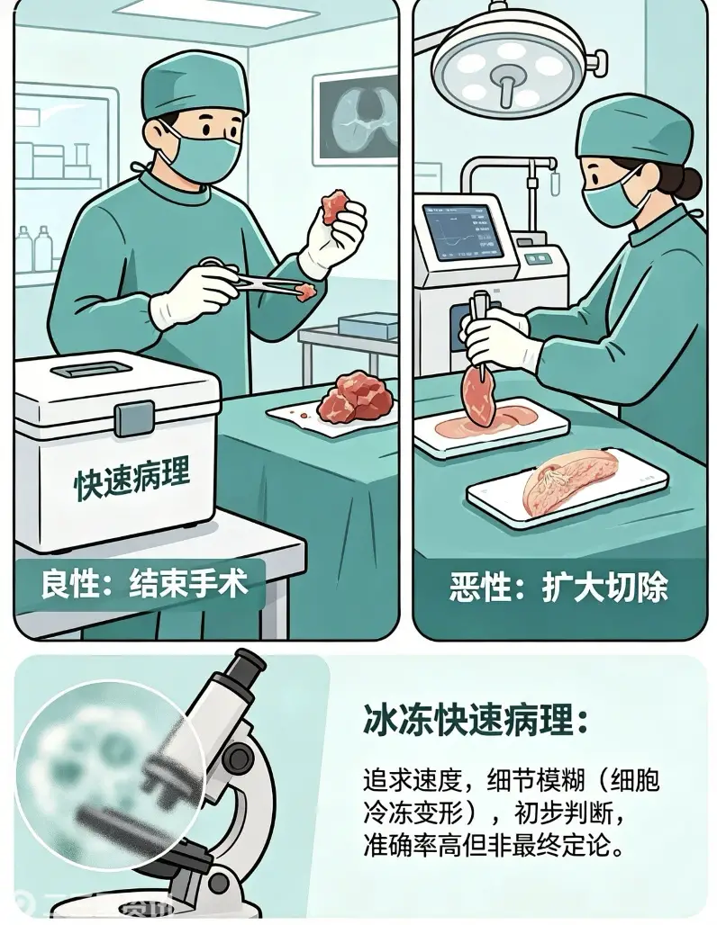 手术做到一半,外科医生切下一小块组织,立刻送到病理科。我们用低温把组织快速冻硬,切成薄片,显微镜下快速观察。目的只有一个:给手术当场指路——是良性就结束手术,是恶性就要进一步处理。