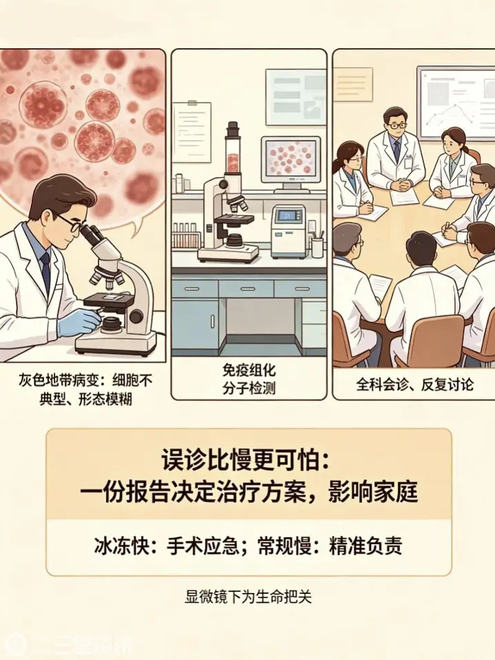 对病理人来说,误诊比慢更可怕。一份报告决定治疗方案,甚至影响一个家庭。宁肯慢一点、细一点,也不能错一点。