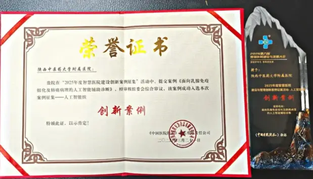 此次获奖,既是行业对医院在AI+病理融合创新应用的高度认可,更是医院推进智慧医院高质量建设的重要里程碑。未来,陕西中医药大学附属医院将以此为契机,紧扣智慧医疗创新发展导向,持续规范并深化新一代人工智能技术在医疗场景的落地应用,推动信息技术与临床服务、质控管理深度融合,聚焦前沿关键问题凝练经验成果,不断提升智慧诊疗与精细化管理水平,夯实医院高质量发展根基,为健康陕西建设贡献坚实数智力量。