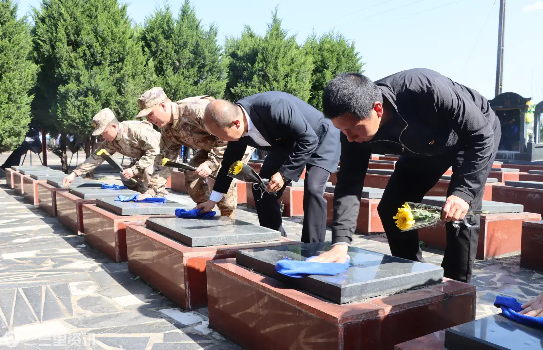 随后,各位领导庄重整理花篮缎带,向革命英烈致以崇高敬意。县退役军人事务局党组书记、局长杨旻棕现场分享感悟,叮嘱大家将英烈精神融入日常,立足本职实干笃行,守护好英烈用生命换来的美好家园。活动最后,全体人员手持鲜花,依次擦拭烈士墓碑、敬献鲜花,少先队员认真模仿大人的动作,小小身影彰显红色传承的坚定信念。