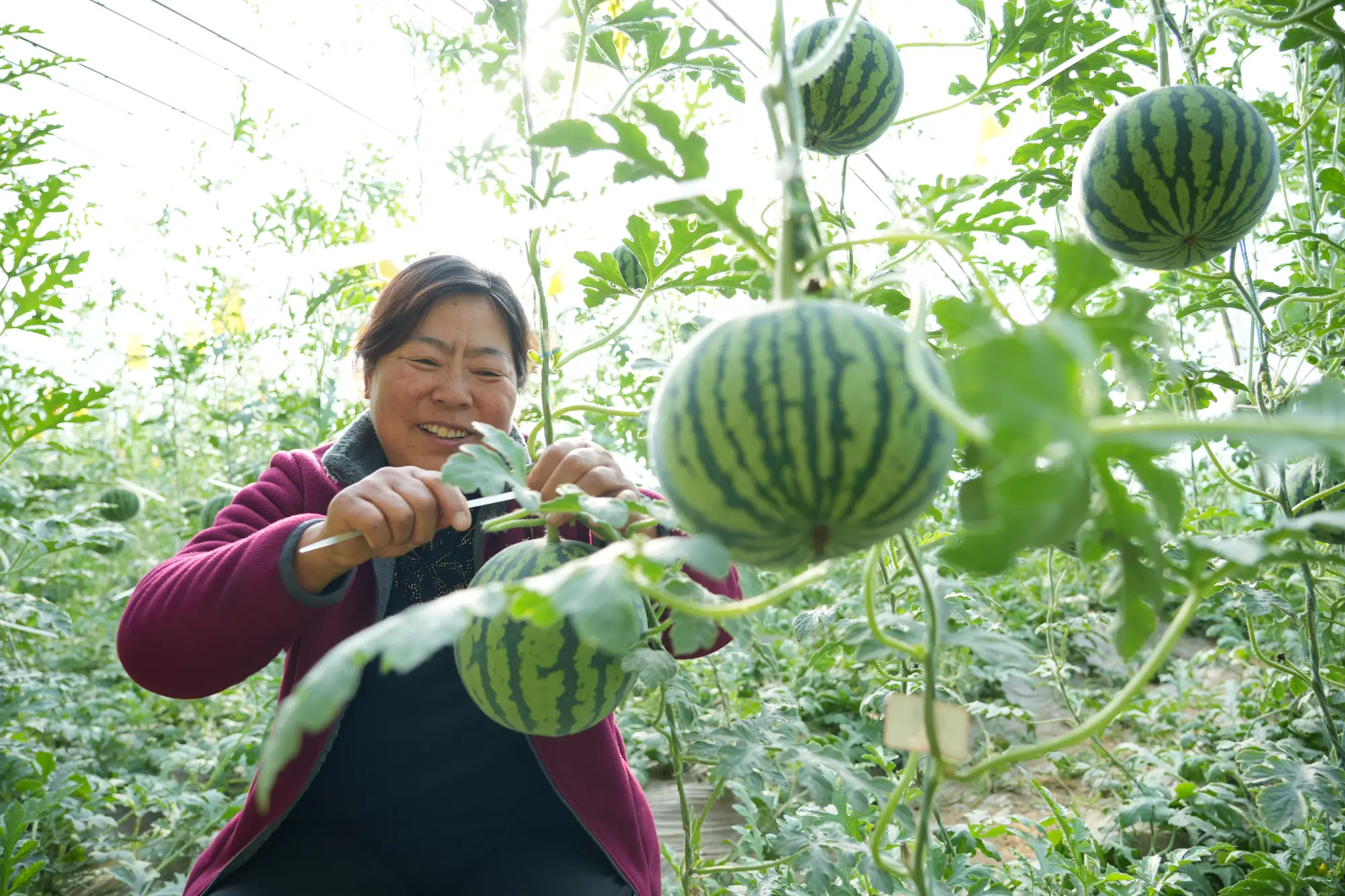 有着20多年设施农业经验的张玉岗夫妇,穿梭在大棚间精细打理。他们熟练做好控温、整枝、病虫害防治,今年还新增黄板、补光灯等设备,为丰产提质保驾护航。“甜瓜每斤采摘价30元,周末游客多,亩产约4000斤,采摘期可持续一个月。”张玉岗介绍道,“再过20天左右麒麟瓜上市,每斤能卖十二三元,市场认可度也很高。”