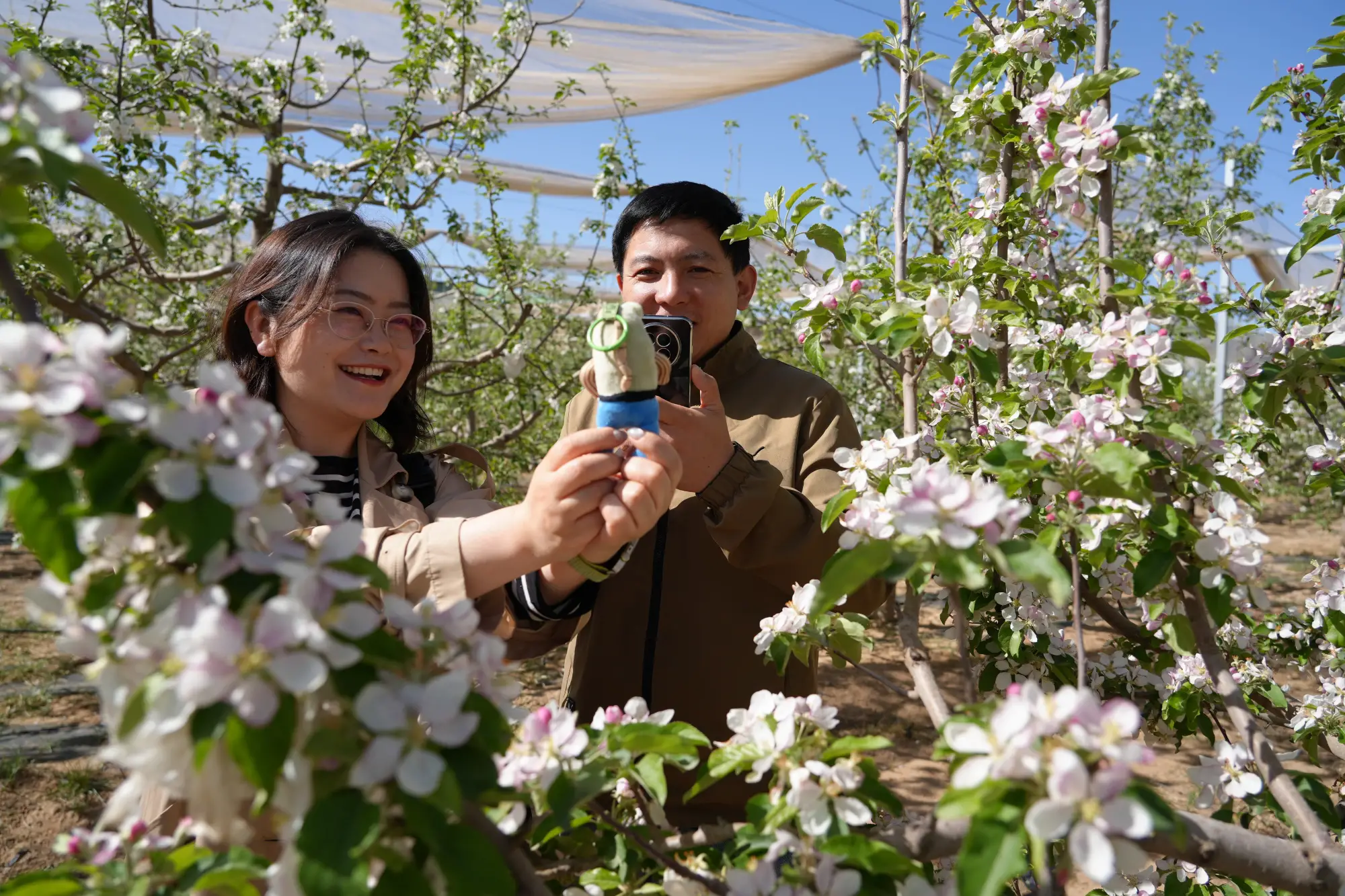 果园内,农场负责人肖士伟正和工人抢抓花期,开展授粉、疏花等管护工作。该果园已挂果10年,面积百亩,主打优质红富士苹果。农场推行水肥一体化、绿色标准化种植,精细化做好花期管理,为苹果提质增效筑牢基础。
