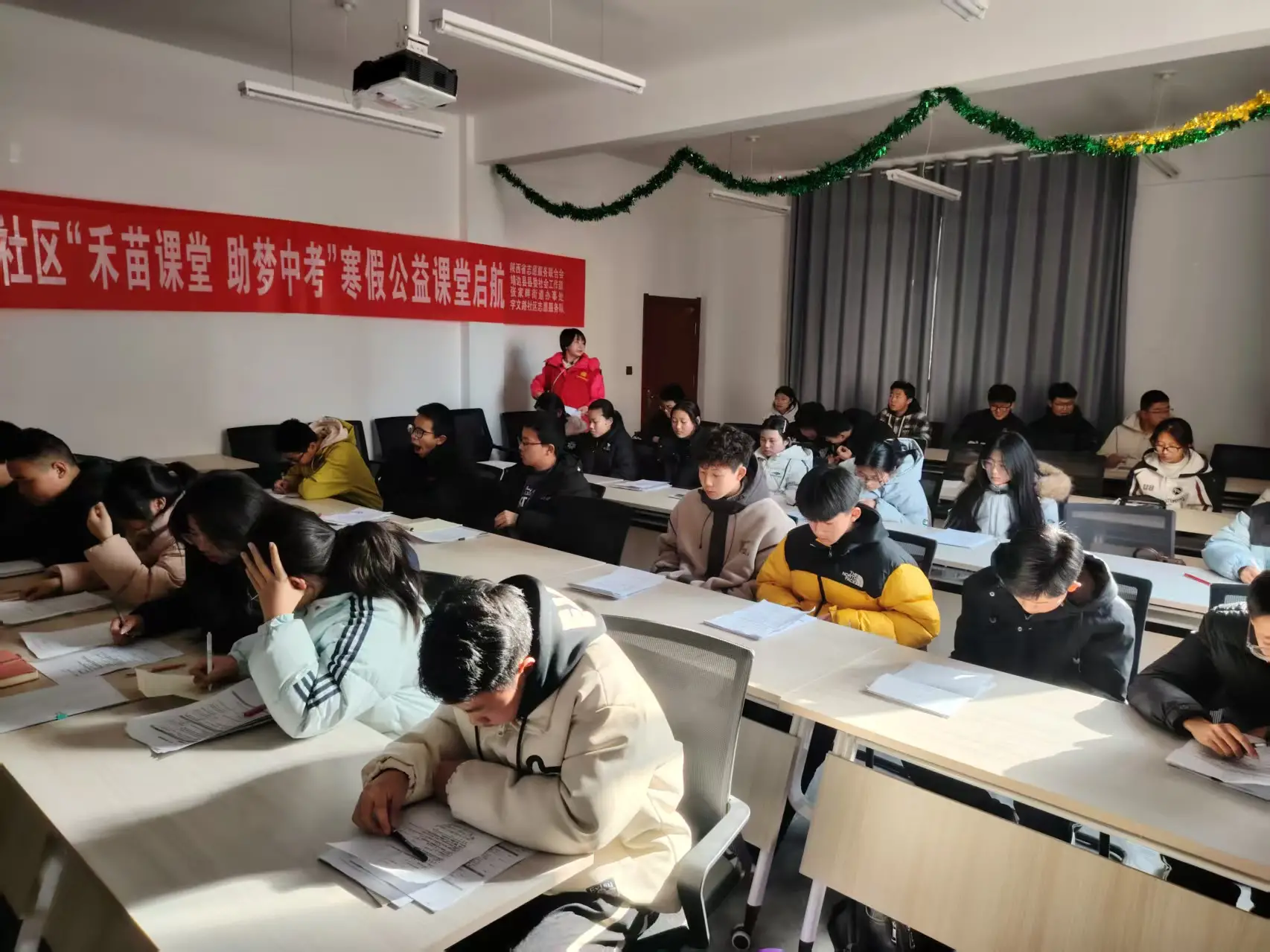 寒假期间,靖边县张家畔街道宇文路社区新时代文明实践站在陕西省民政厅和陕西省志愿服务联合会的支持下,启动“禾苗课堂·助梦中考”寒假公益课堂,为辖区内40余名初三学生搭建温暖安心的成长护航站,切实解决辖区内初三学生寒假学习需求,助力学子轻松备考、冲刺中考。