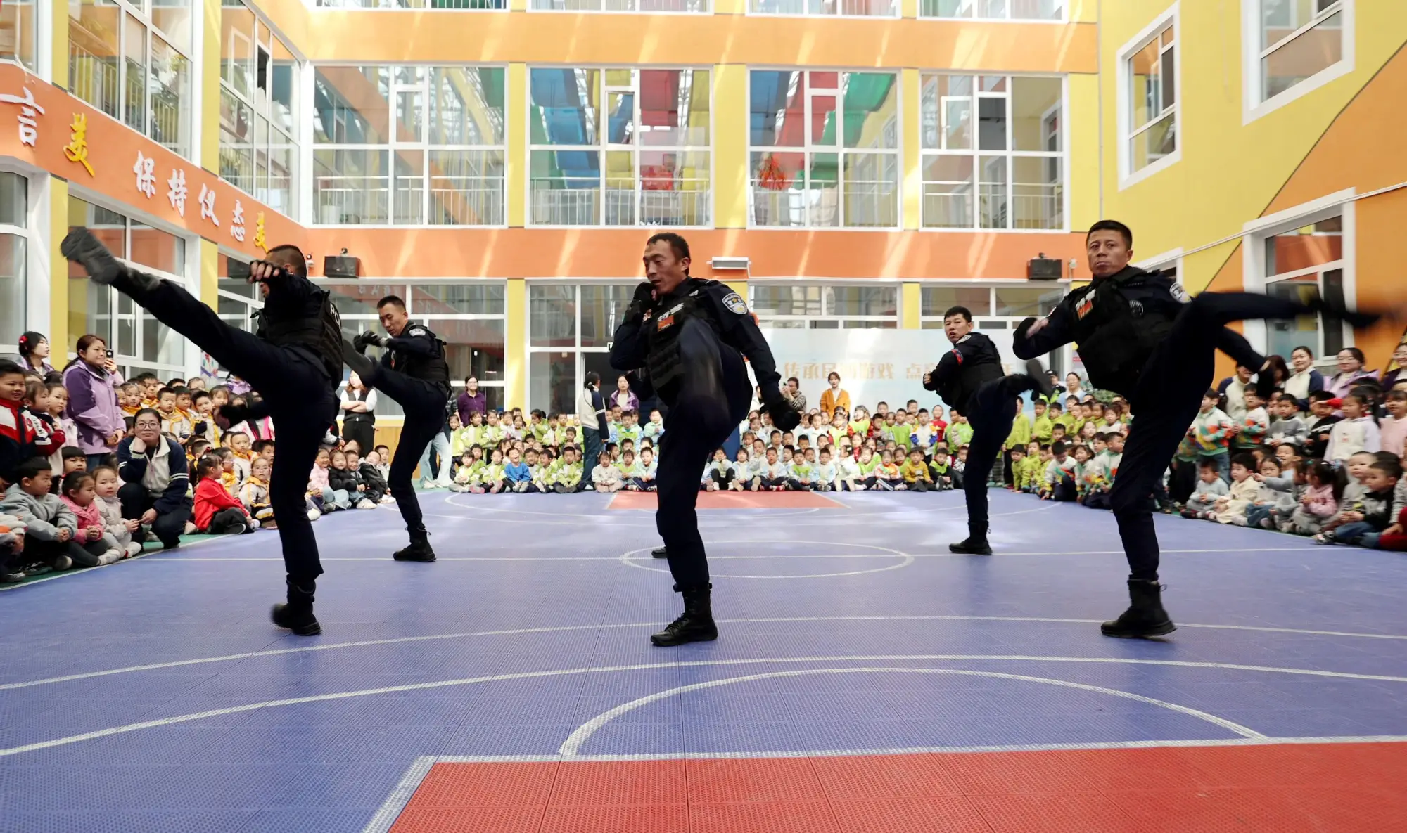 最让人热血沸腾的,当属擒敌拳表演!特巡警队员们动作整齐、刚劲有力,一招一式尽显飒爽英姿,赢得了老师和孩子们阵阵的掌声和欢呼声,小朋友们纷纷化身“小迷弟小迷妹”,为警察叔叔点赞。