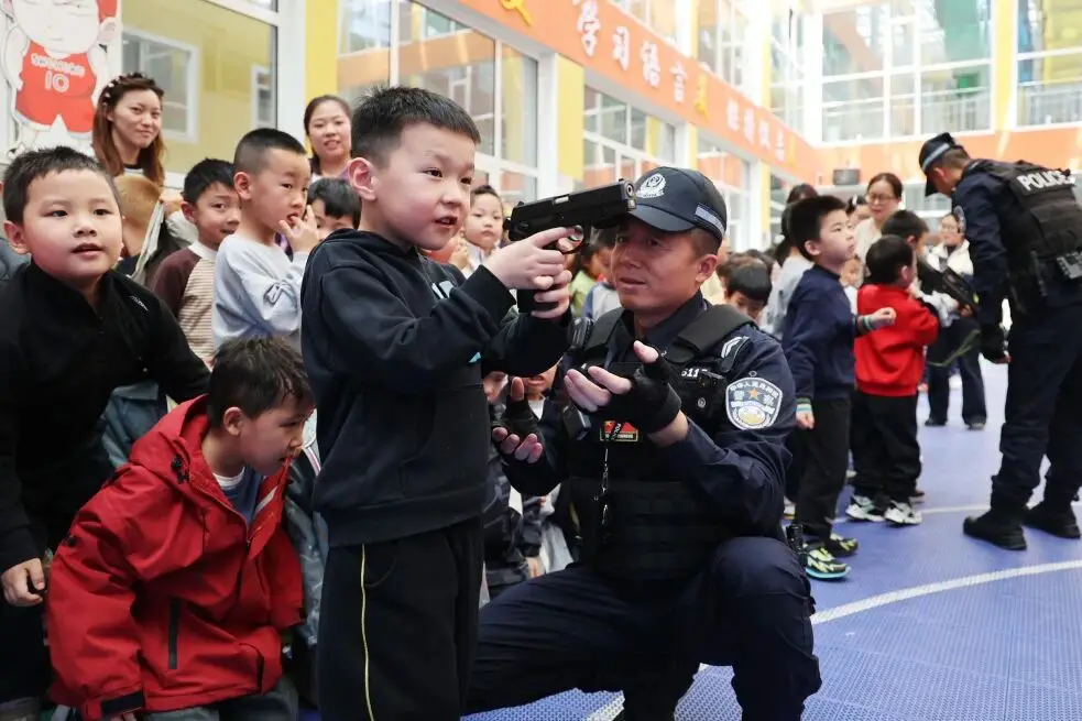活动开始,应急处置演练就吸引了全体师生的目光。模拟“可疑人员”强行闯入校园,特巡警队员迅速出击、果断处置,干净利落地将“目标”制服。小朋友们直呼“坏人被抓住啦!”