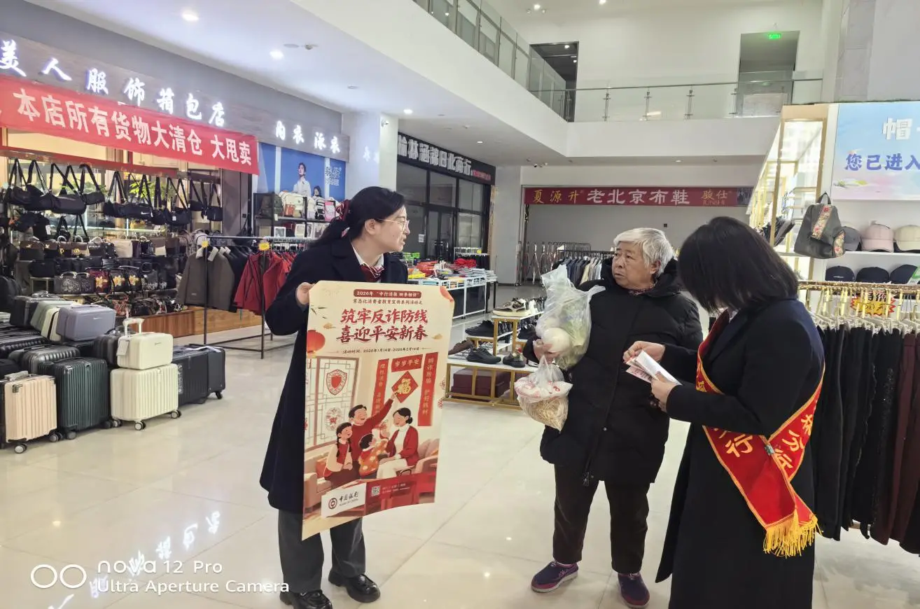 活动当天,支行宣传团队分别深入商场内外。在商场内部,员工们穿梭于服饰箱包店、鞋店等商铺之间,向正在采购年货的中老年顾客重点讲解“冒充公检法”“养老投资诈骗”“虚假购物退款”等春节高发的诈骗手法,结合真实案例提醒大家不轻易转账、不泄露个人信息。在商场入口处,宣传人员向过往市民发放反诈宣传折页,用通俗易懂的语言普及金融反诈知识,并引导大家关注官方反诈平台,遇到可疑情况及时联系银行或报警。