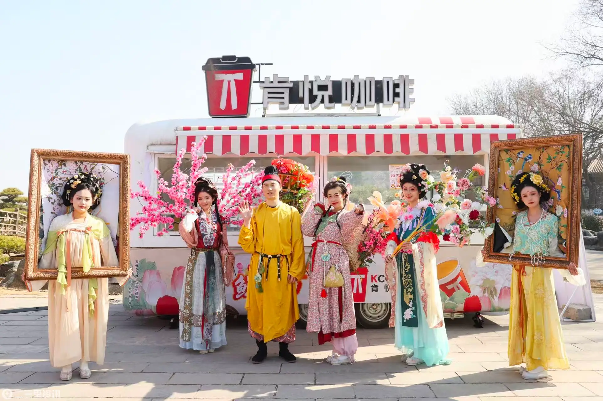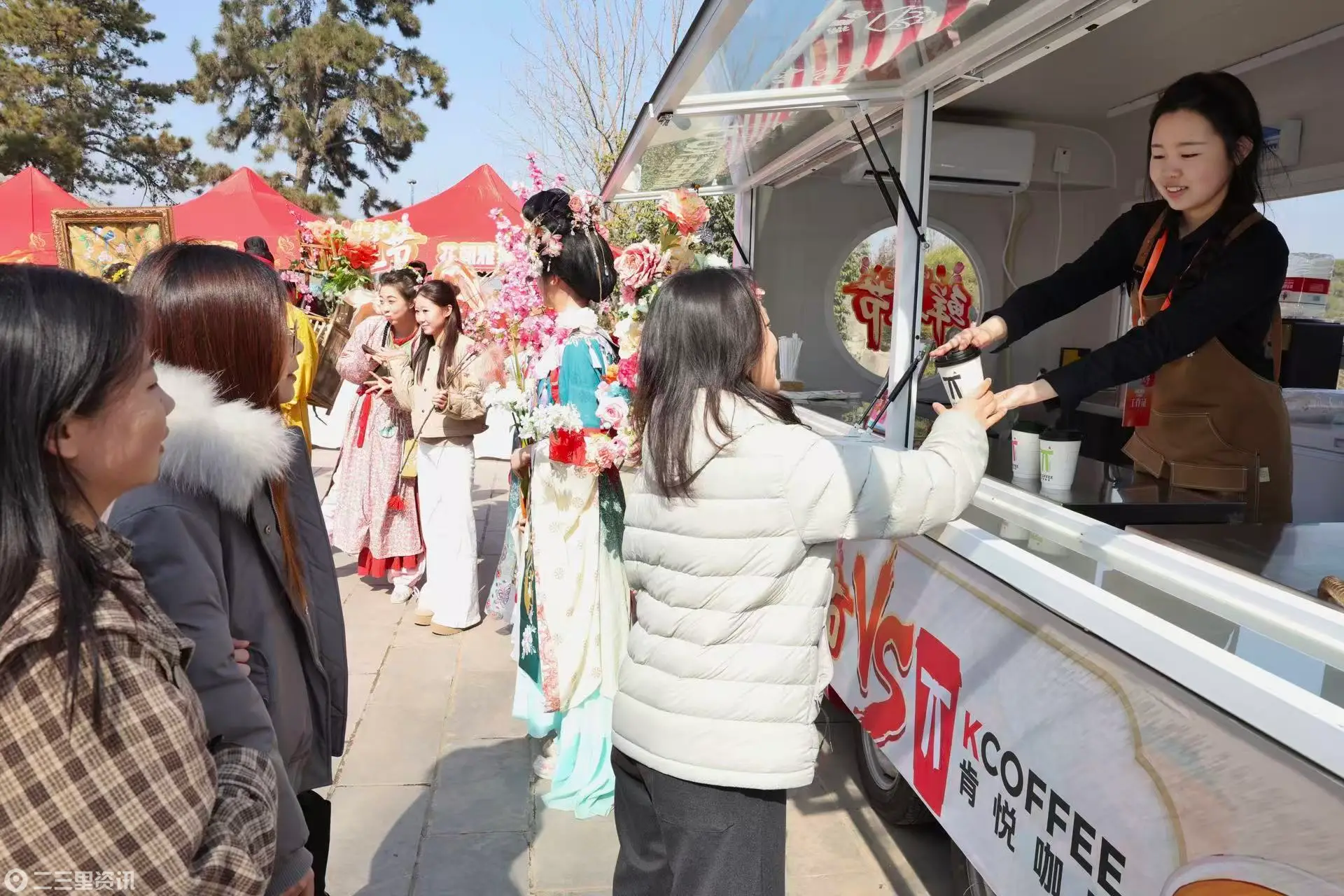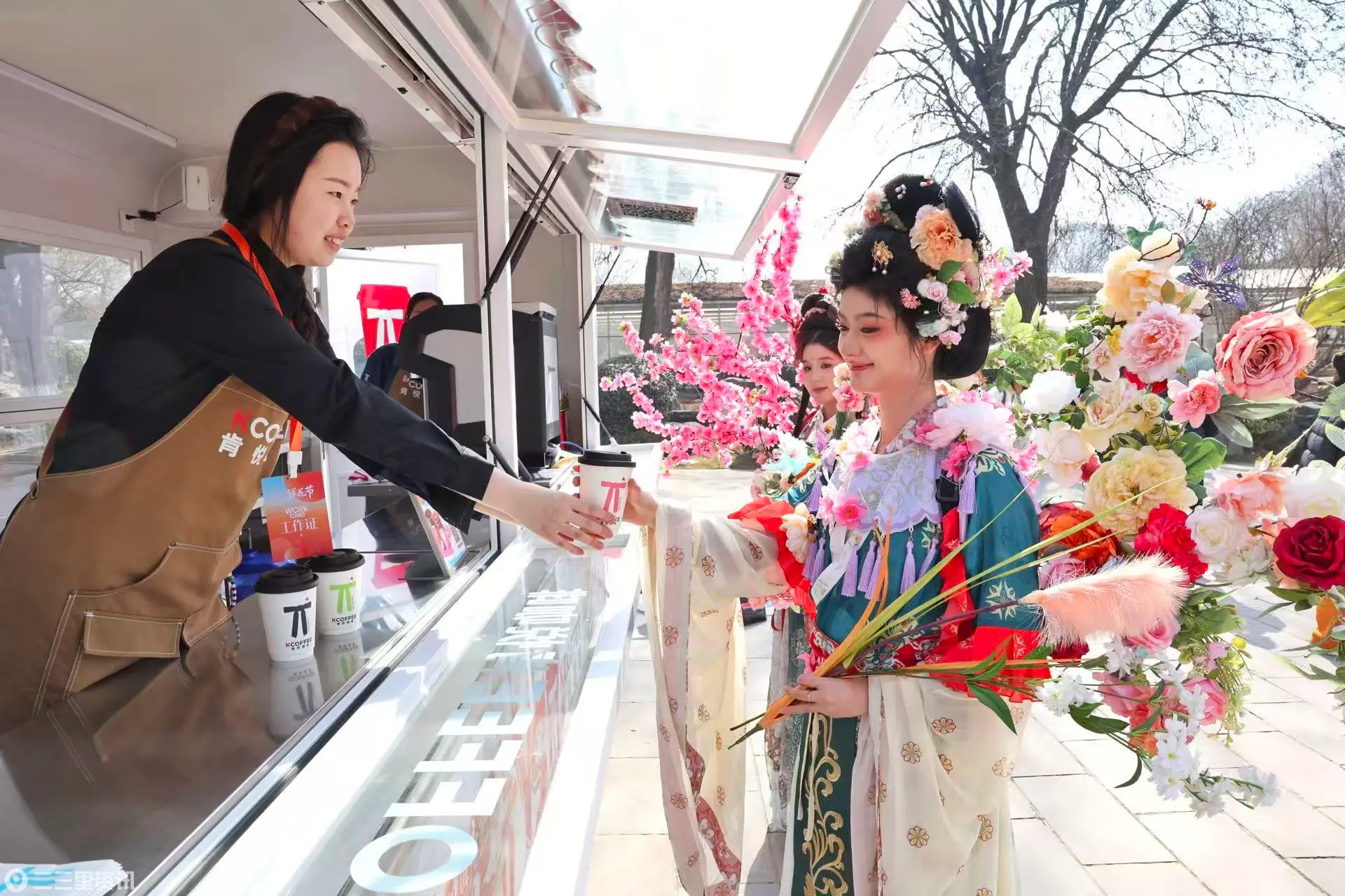 10时许,唐苑的郁金香花海迎来第一波游客,而肯悦咖啡的移动展位前也排起了长队。不少游客刚从花海中拍完照,就迫不及待地走到展位前,点上一杯红苹果热美式或热果饮,在春日微风中轻啜一口,瞬间驱散了游园的疲惫。“逛了一上午花海,脚都酸了,来杯美式太爽了!” 穿着汉服的李悦一边举着咖啡与肯悦咖啡车合影,一边笑着说:“这个展位和郁金香花海太搭了,拍出来的照片氛围感拉满。