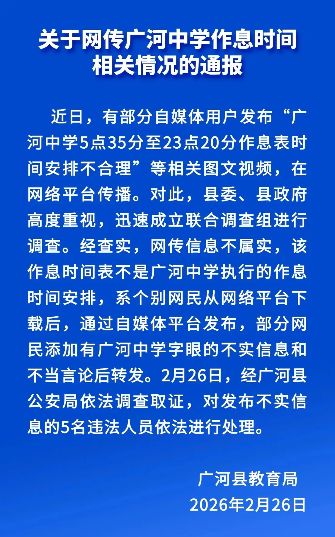 2月26日晚,甘肃省广河县教育局发布情况通报,经查,网传信息不属实,该作息时间表不是广河中学执行的作息时间安排,系个别网民从网络平台下载后,通过自媒体平台发布,部分网民添加有广河中学字眼的不实信息和不当言论后转发。26日,经广河县公安局依法调查取证,对发布不实信息的5名违法人员依法进行处理。