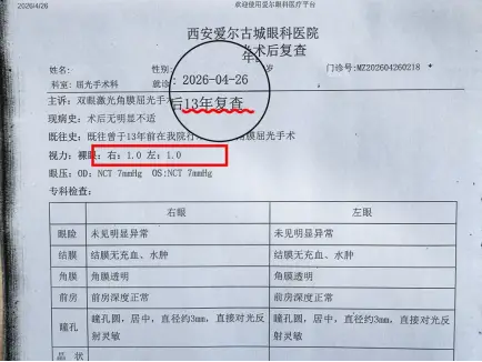 2012年,全飞秒近视手术技术首次落地西北,西安爱尔古城眼科成为西北首批引入该技术的医院。彼时,20多岁的姐姐抱着尝试的心态,成为陕西首例全飞秒手术的亲历者。主刀医生正是有着近20年眼科临床经验的赵瑞博主任。术后13年来,她双眼视力长期稳定清晰,生活与工作均未受近视困扰。与许多患者不同,她在摘镜之后并未“失联”,而是持续关注着医院的发展——她亲眼见证了医院屈光手术科室设备不断升级、专家团队日益壮大,心中对西安爱尔古城眼科医院的信任也愈发坚定。